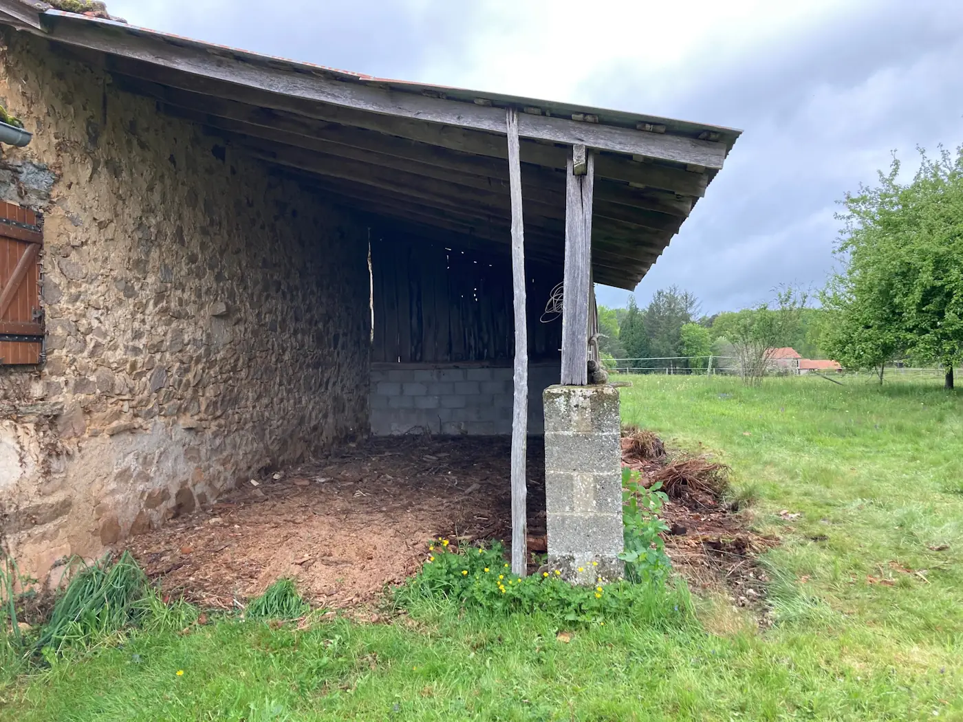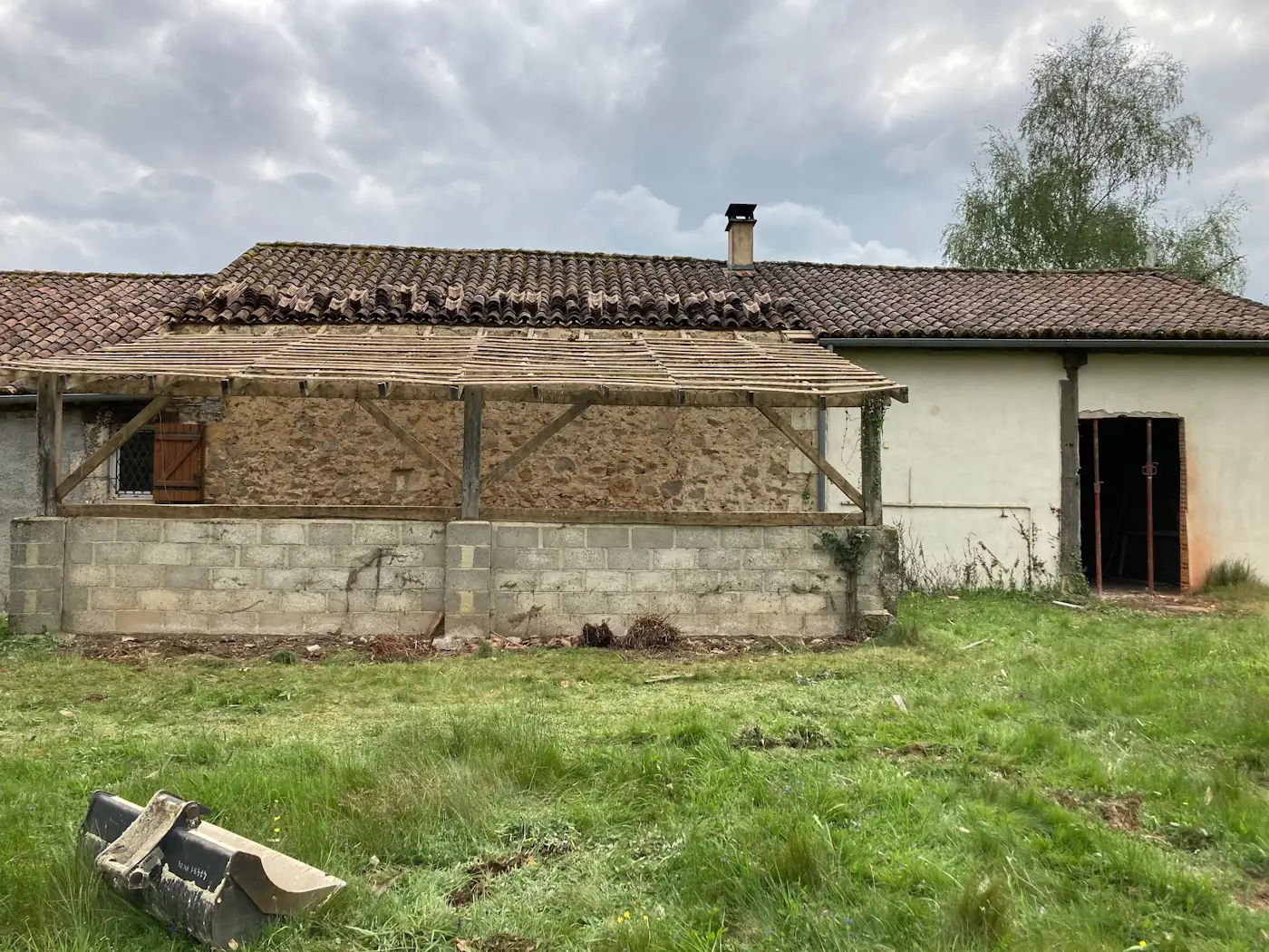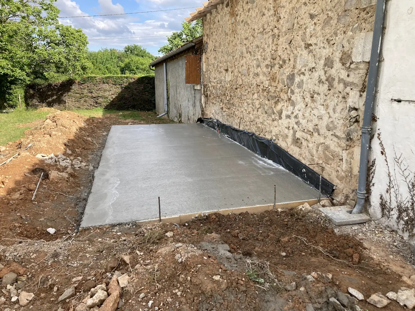 I know I said the building works were by now all finished but there were a couple of last additions. Dad set up some much-needed guttering for the log shed and Benoît made us a concrete path from the shed to the house so we’d no longer be traipsing in mud every time we brought in some wood.