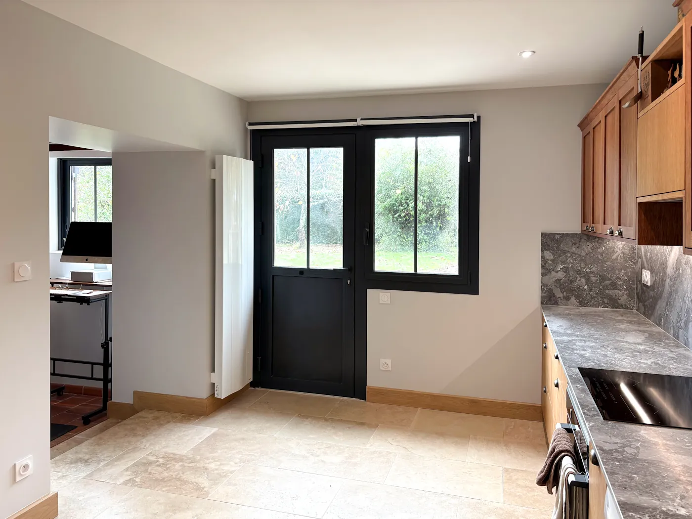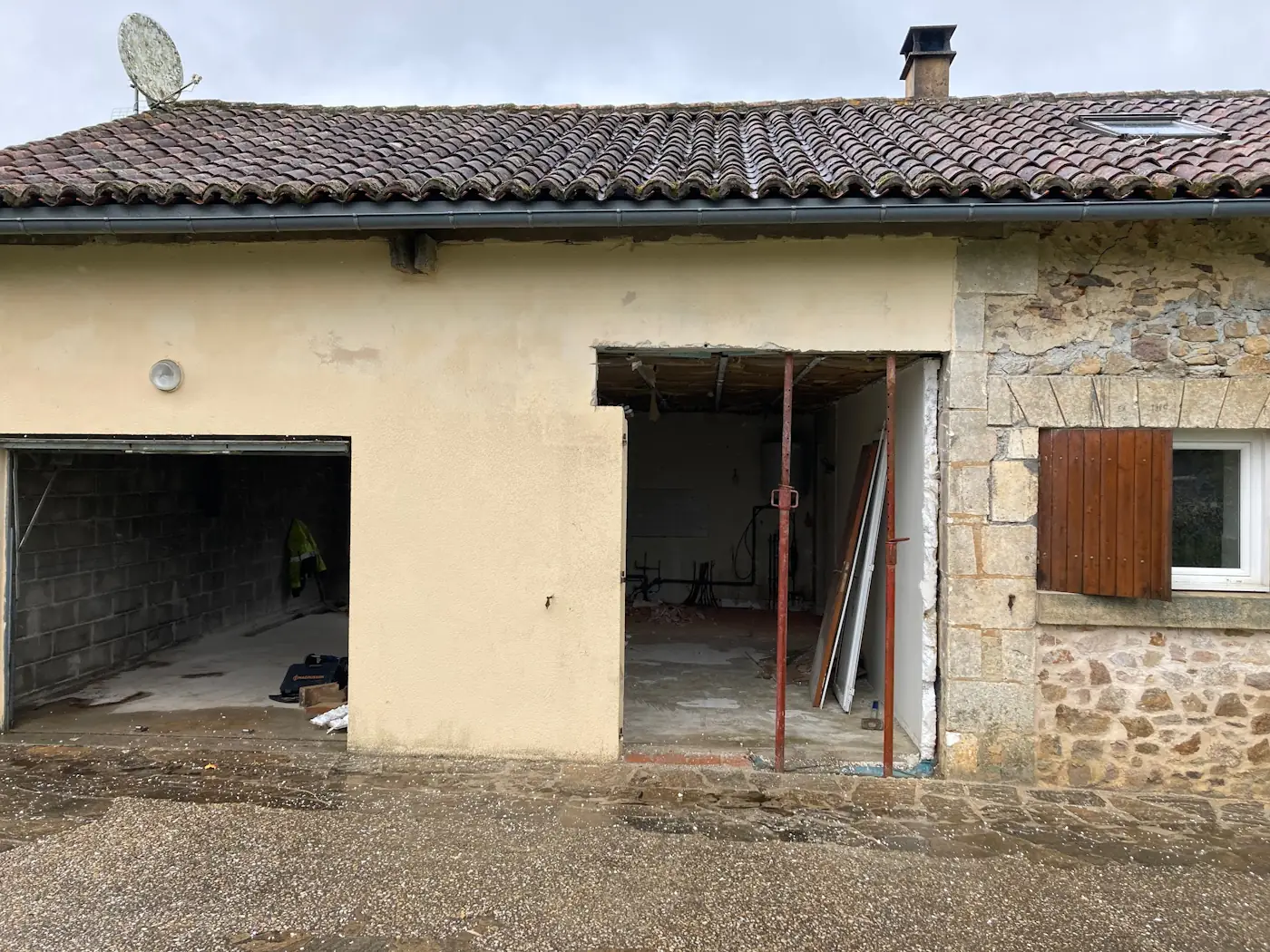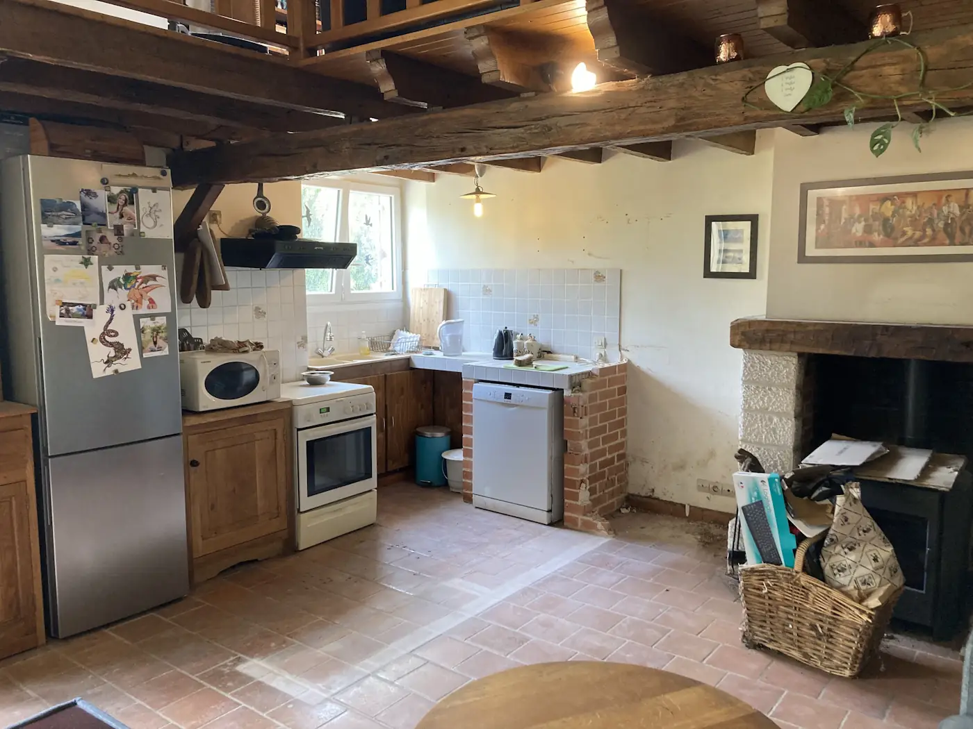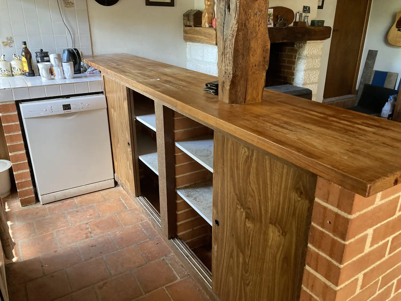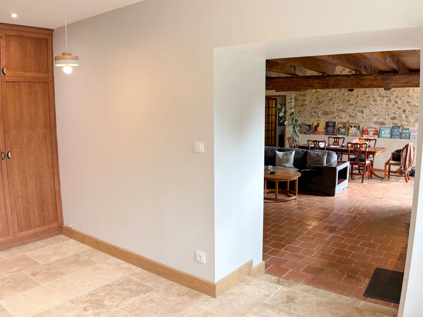 We had a full house again on the following Monday: the masons returned and began work on the log shed walls while the plasterers got on with sanding and adding the first coats of paint. They all returned the following day, along with Benoît, who did the tiling in the laundry area. By the end of the week, the masons removed the supports under the new opening and the plastic covering, allowing us to appreciate for the first time what our remodelled lounge and kitchen were going to look like.