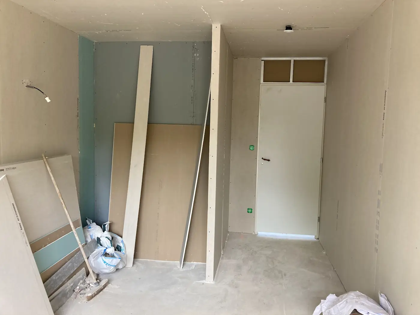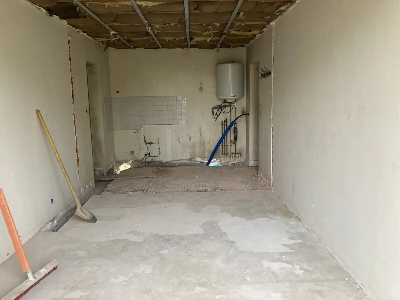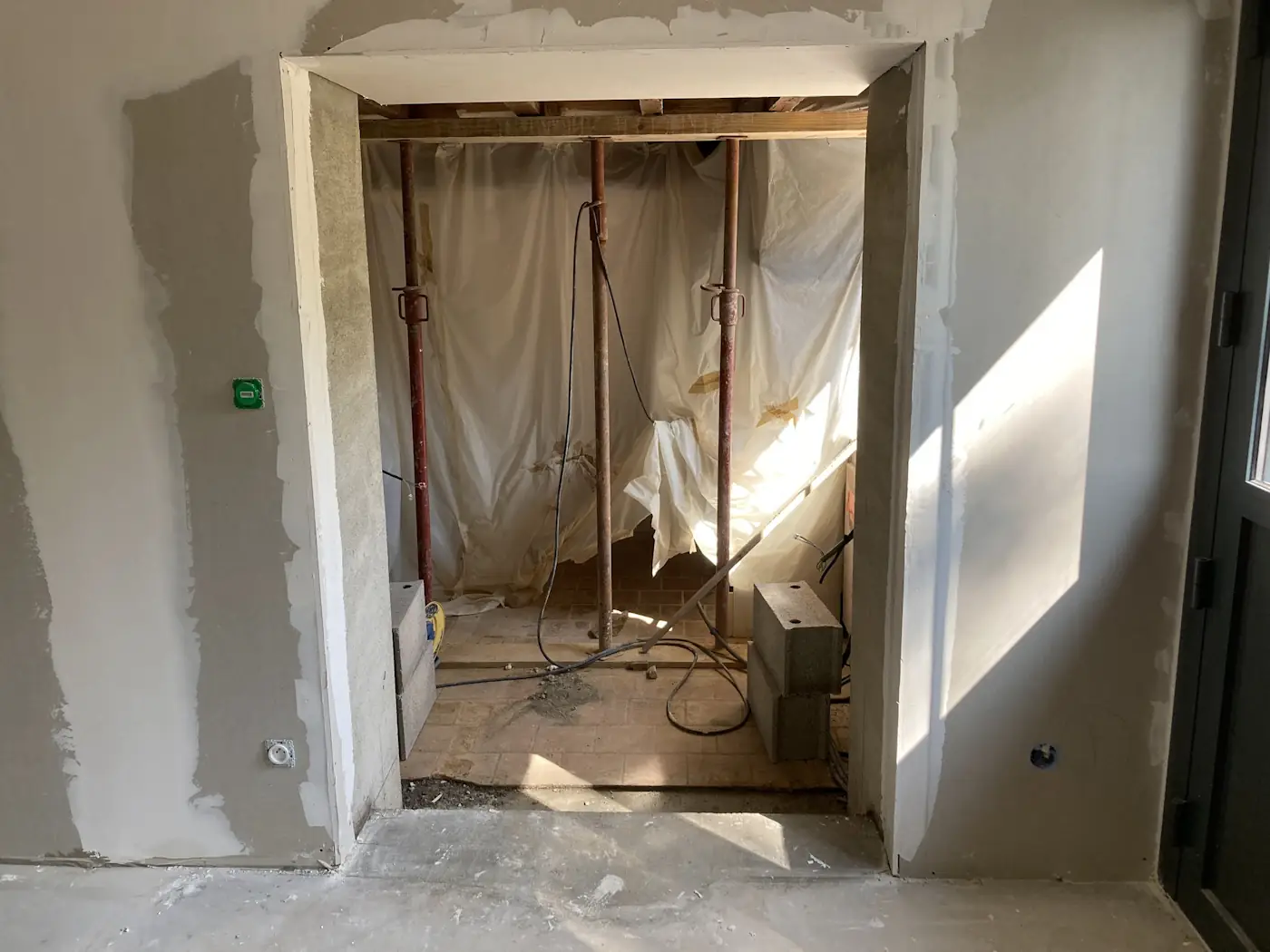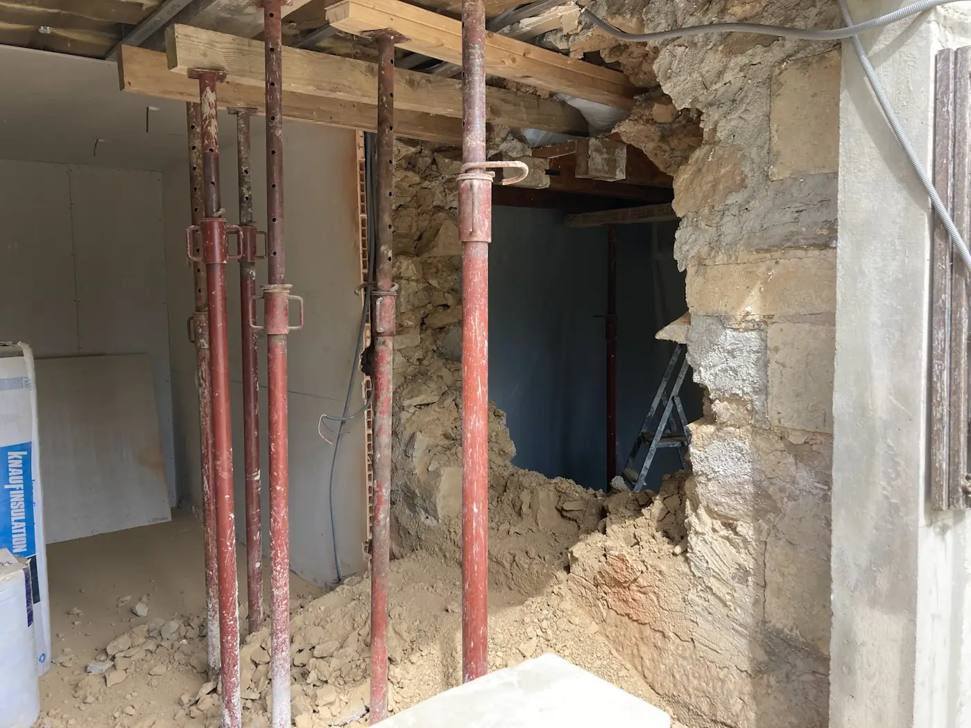 Two major steps in our building works were scheduled for the next week: the fitting of our new doors and windows, and the creation of the opening between the lounge and future kitchen. These were two things we very much wanted to happen at the same time to avoid having gaping holes in the house. Unfortunately, the doors and windows had to be pushed back as the joiners hadn’t received the glass, now expected mid-June. Despite this, we kept to the plan for the wall opening.