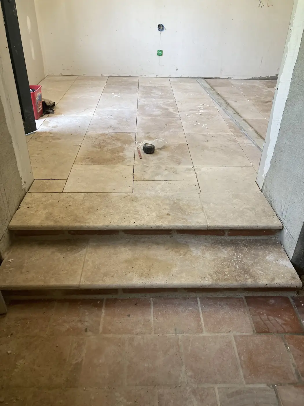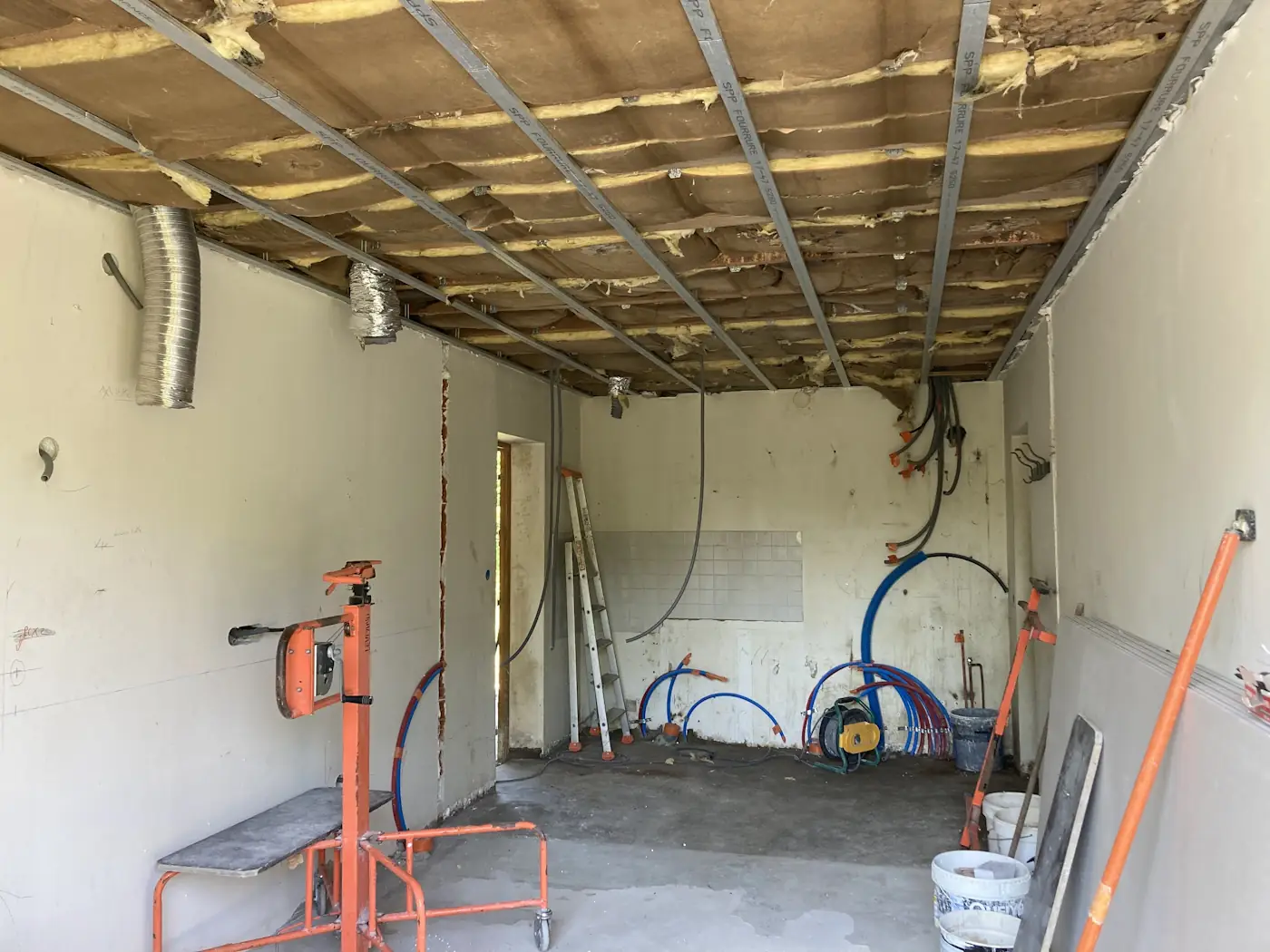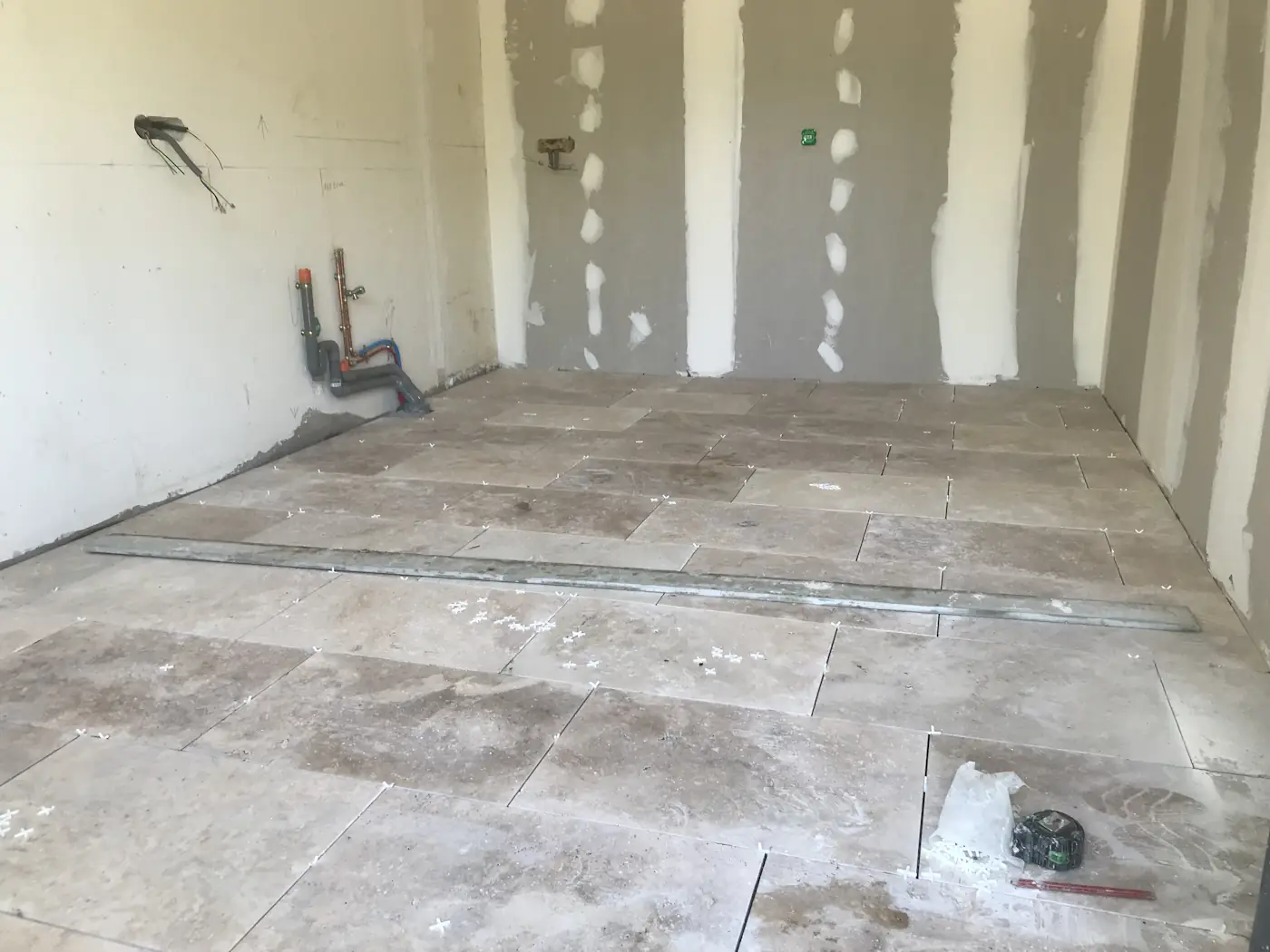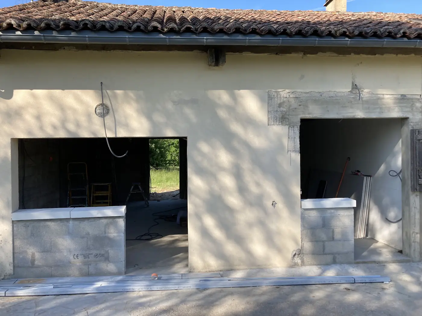 That weekend was a long one, with La Fête Nationale falling on the Monday. Benoît came on Saturday to tile the bedroom, then again on Monday to finish off. Despite it being a holiday, the masons returned too and for a minute we dared to hope they were going to put in a full week, but they vanished after just two days. Meanwhile, the painter worked on the lounge opening and other finishing touches.
