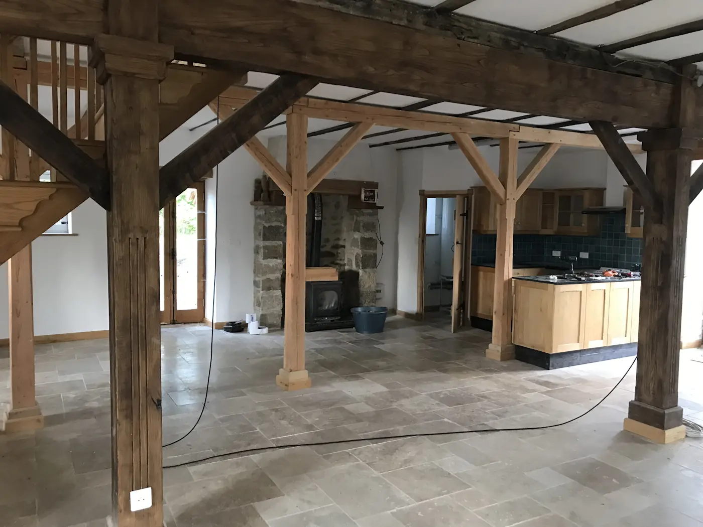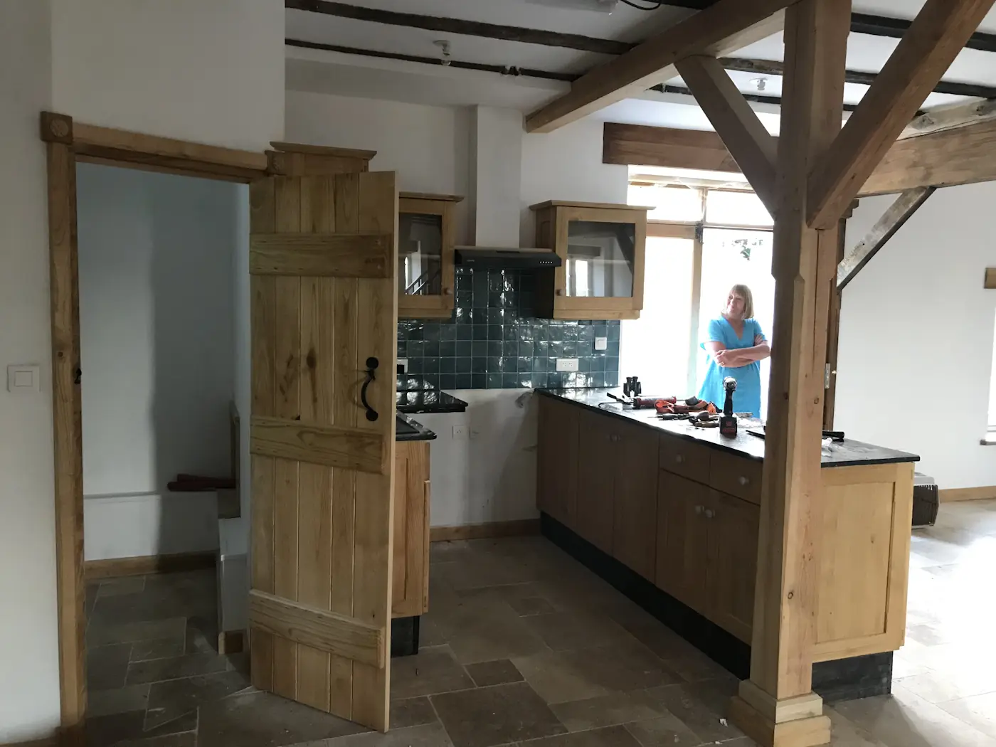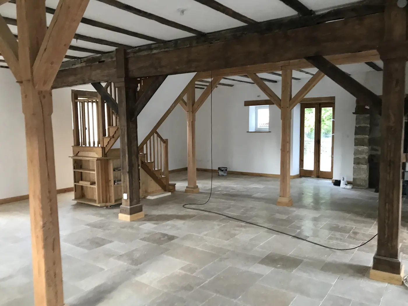 The next week, Marty the joiners showed up and fitted all the windows and doors, meaning we finally had a sealed and secure home again. This done, the plasterers and masons could now resume their work. Unfortunately, the latter pulled one of their vanishing acts, leaving our new log shed still nothing more than a foundation. Benoît made a start on the tiling by doing the screed in readiness to start on the kitchen, which he finished over the weekend.