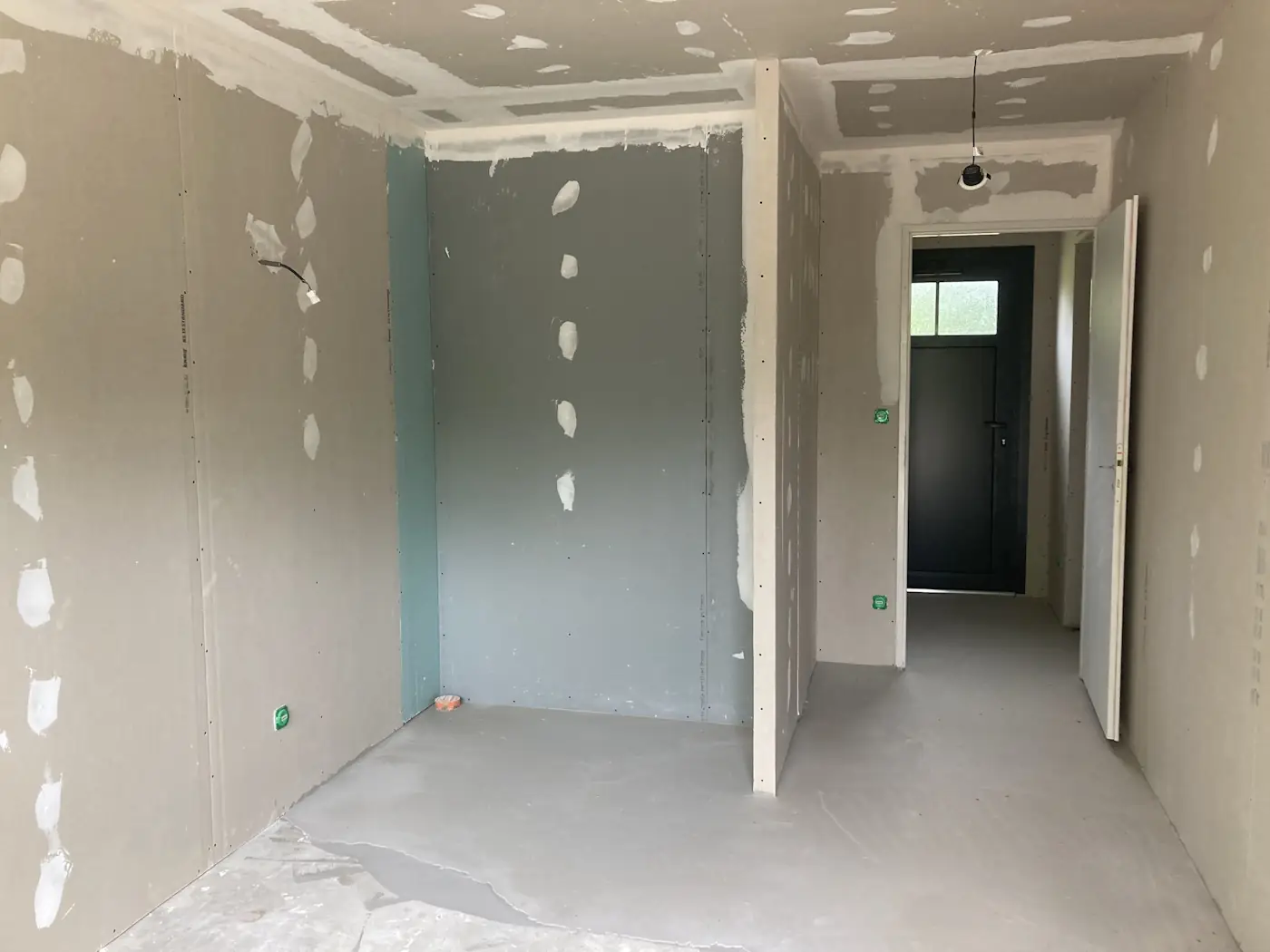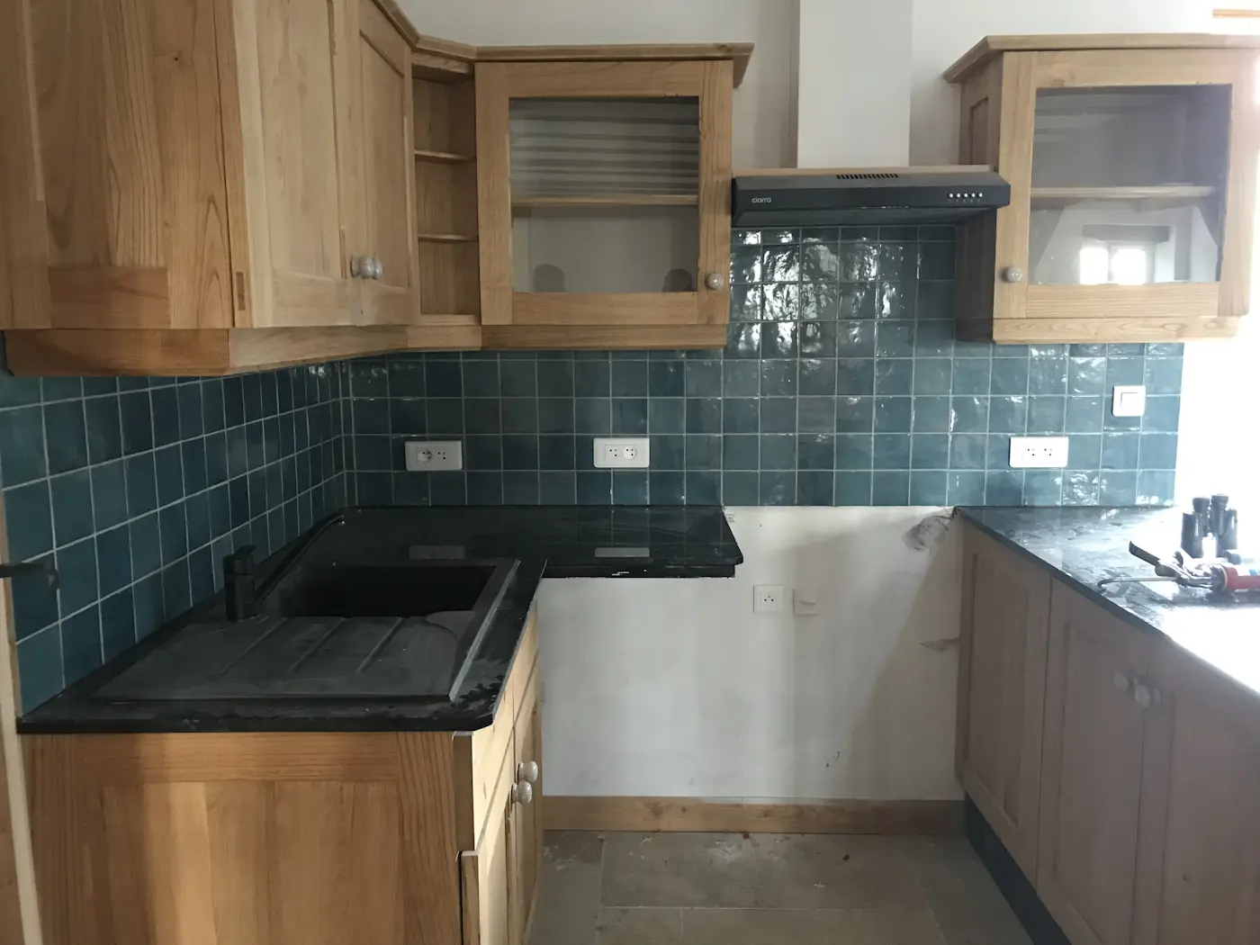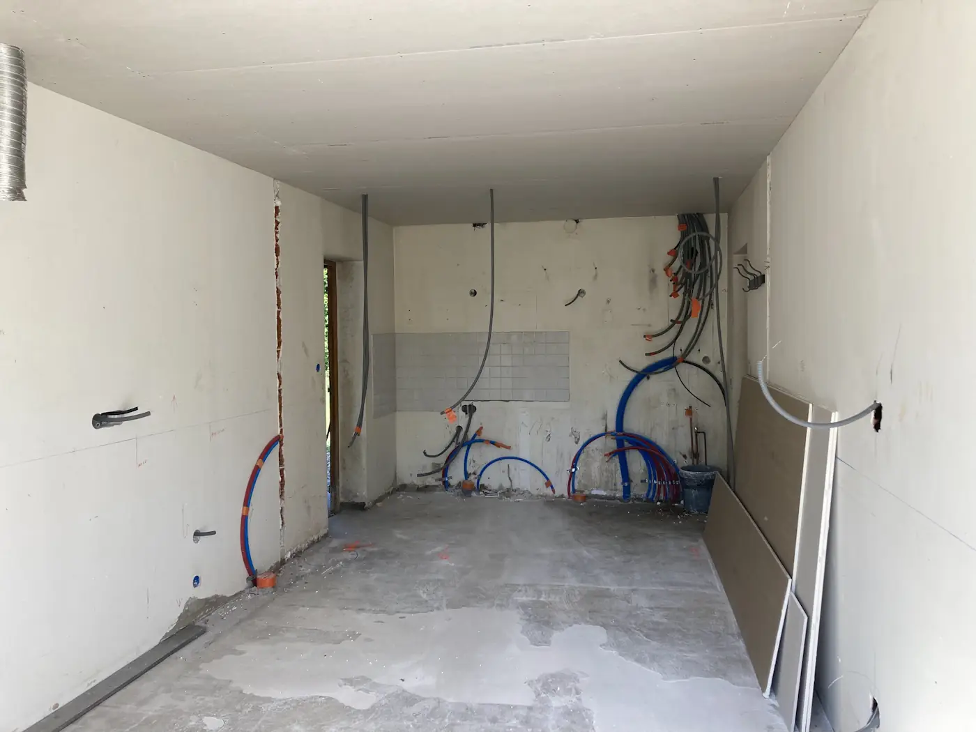 The next week, Marty the joiners showed up and fitted all the windows and doors, meaning we finally had a sealed and secure home again. This done, the plasterers and masons could now resume their work. Unfortunately, the latter pulled one of their vanishing acts, leaving our new log shed still nothing more than a foundation. Benoît made a start on the tiling by doing the screed in readiness to start on the kitchen, which he finished over the weekend.