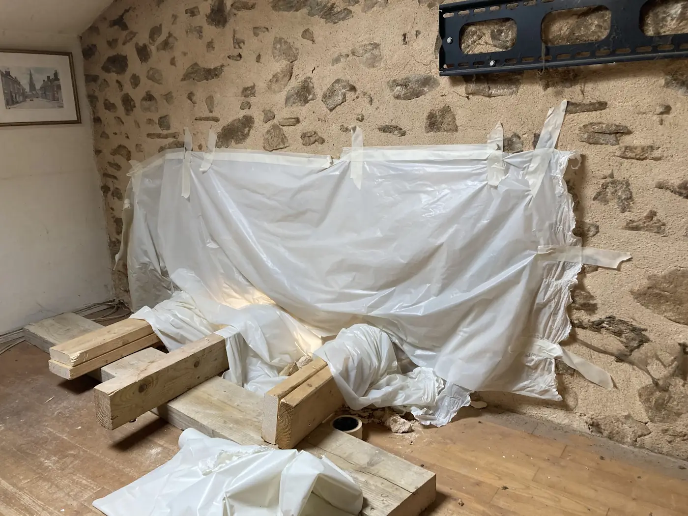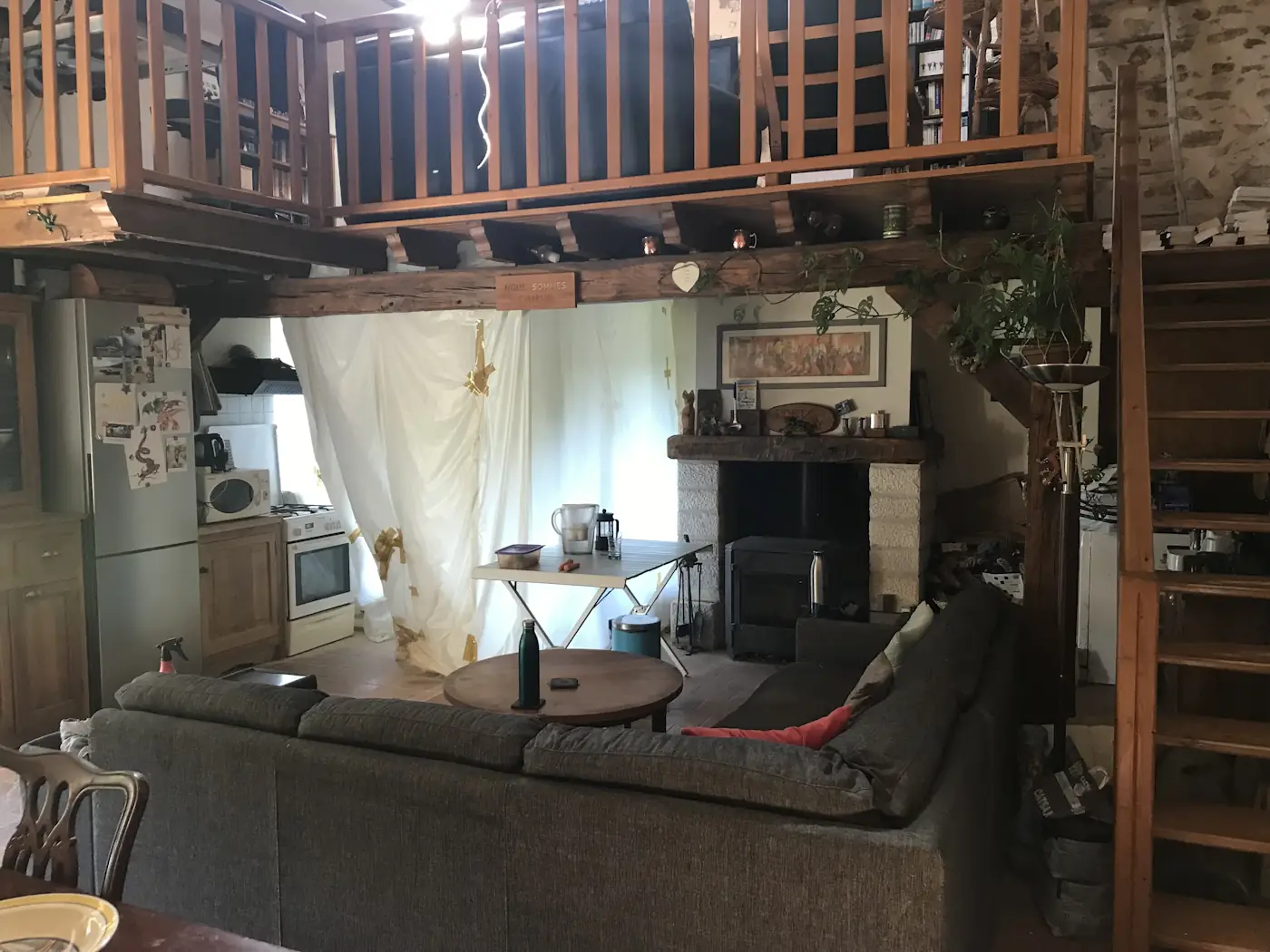 After that, the building works pretty much ceased while we waited for the joiners to come and fit the windows. We put some tarp around the opening to try and keep some heat in and did our best to enjoy the relative peace. The masons briefly reappeared that Thursday in order remove some of the supports under the opening. They also “repaired” the wall above (doing a job so poor even I could tell it was an absolute dog’s dinner), meaning that that evening, we were able to reclaim the mezzanine. That was the last we would see of them for over a week so we enjoyed a quiet bank holiday weekend.