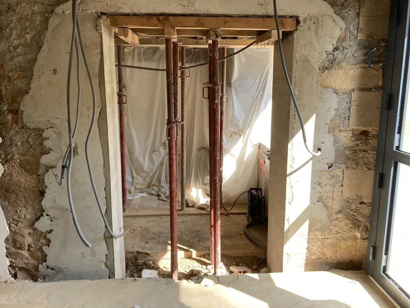 The long-planned and dreaded building works began on the 22nd and it was all guns blazing from day one– jackhammers, buzzsaws, dust and chaos as the masons started on the interior demolitions and new door and window openings.