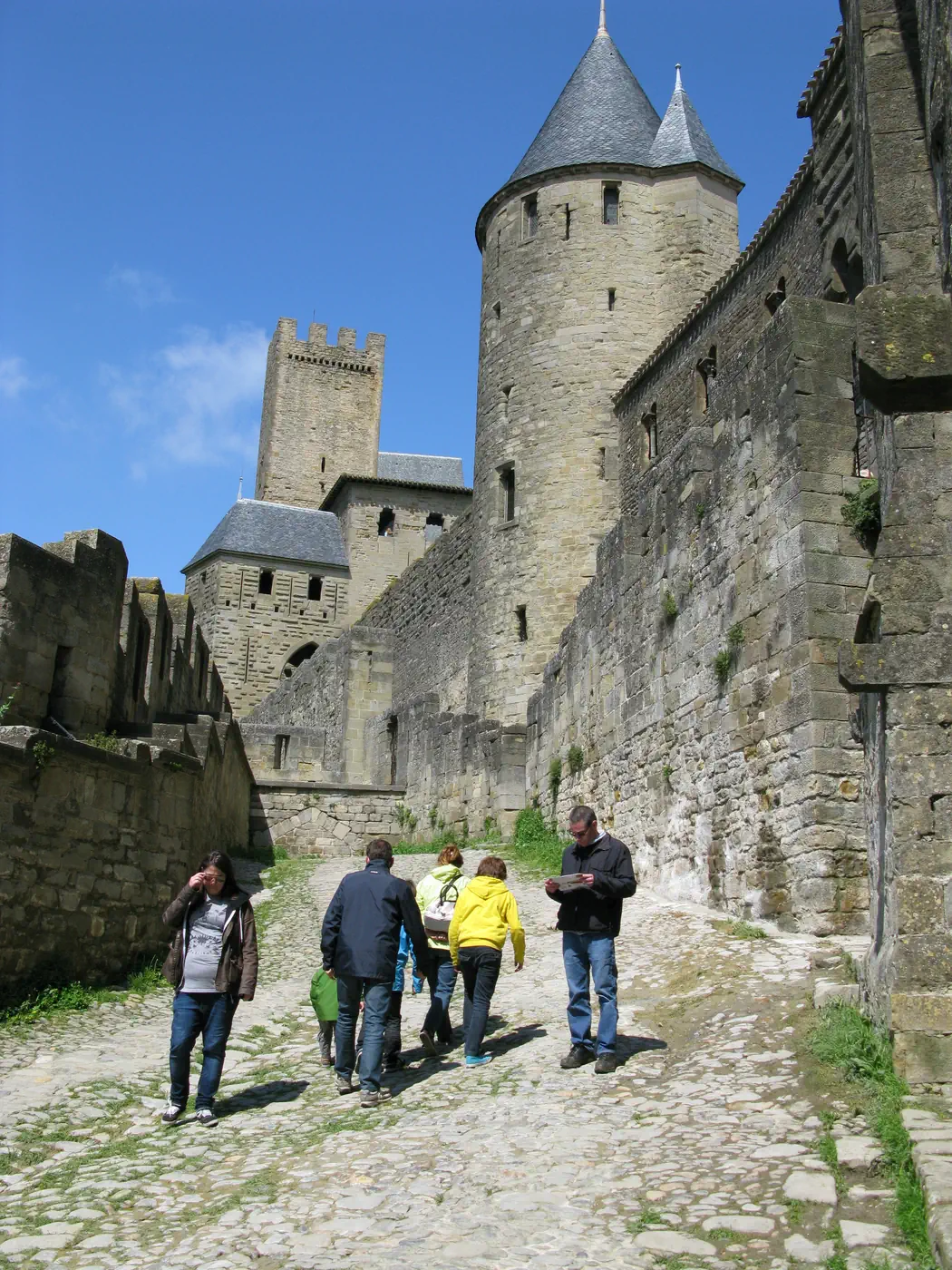 The weather there was about the same as the Dordogne: rain spells and fairly low temperatures, so no-one was impressed to hear that the UK was that weekend experiencing a mini-heatwave while we were stuck inside looking at a swimming pool too cold to be used. Luckily though, the next day wasn’t too bad so we nominated it sight-seeing day and headed off to Carcassonne with Anna, Alexis, Stuart and Asa, leaving Gems and Matt S to chill at home. First stop was the police station for Alexis, who unfortunately had had 2 purses stolen from her bag when out shopping a few days earlier. This went fine and Alexis has a signed statement so should at least be able to claim on the insurance.