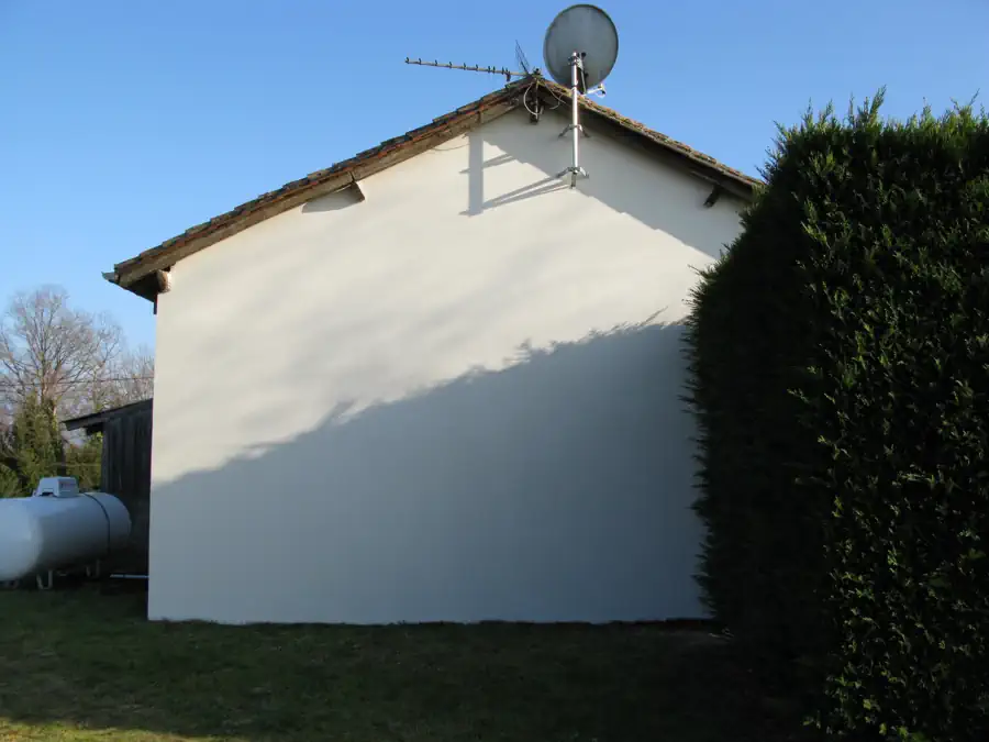 With the weather being so fantastic at the moment, our thoughts are turning more towards the garden – turning the soil in the veggie plot, mowing the grass and pruning the roses etc… Well, we made a bit of a start on outdoor chores on Sunday morning. One of our exterior walls had stains all over it – presumably caused by years worth of rainwater running over the red roof tiles and spilling down the wall, staining them on its way. It looked really awful, and all attempts at scrubbing these stains off had failed, so a number of months ago, I ordered some paint from Lee and Richard to try and cover them over. Well, it took me long enough to get round to it, but that was my Sunday morning project and I have to say I am extremely chuffed with the result – the wall looks 100 times better, even if it took me hours and I got literally covered from head to toe in paint.