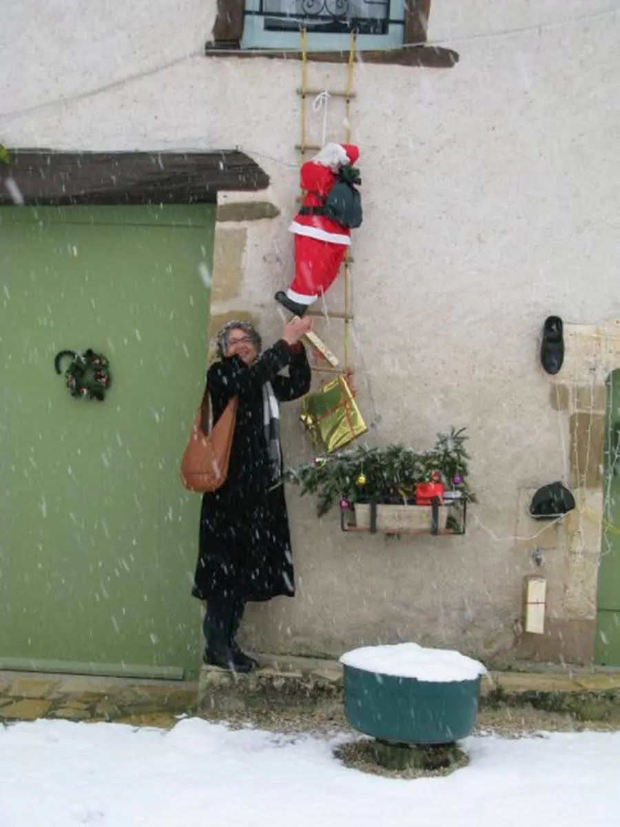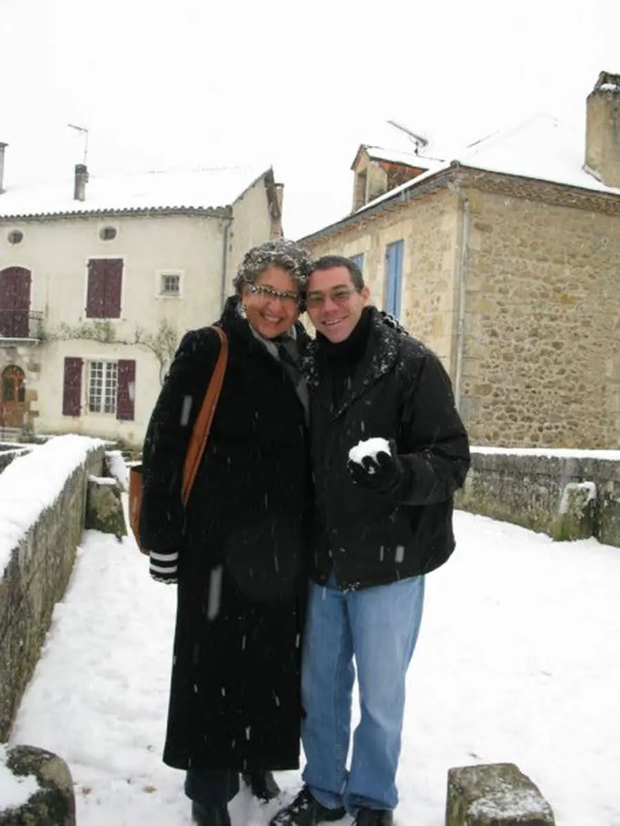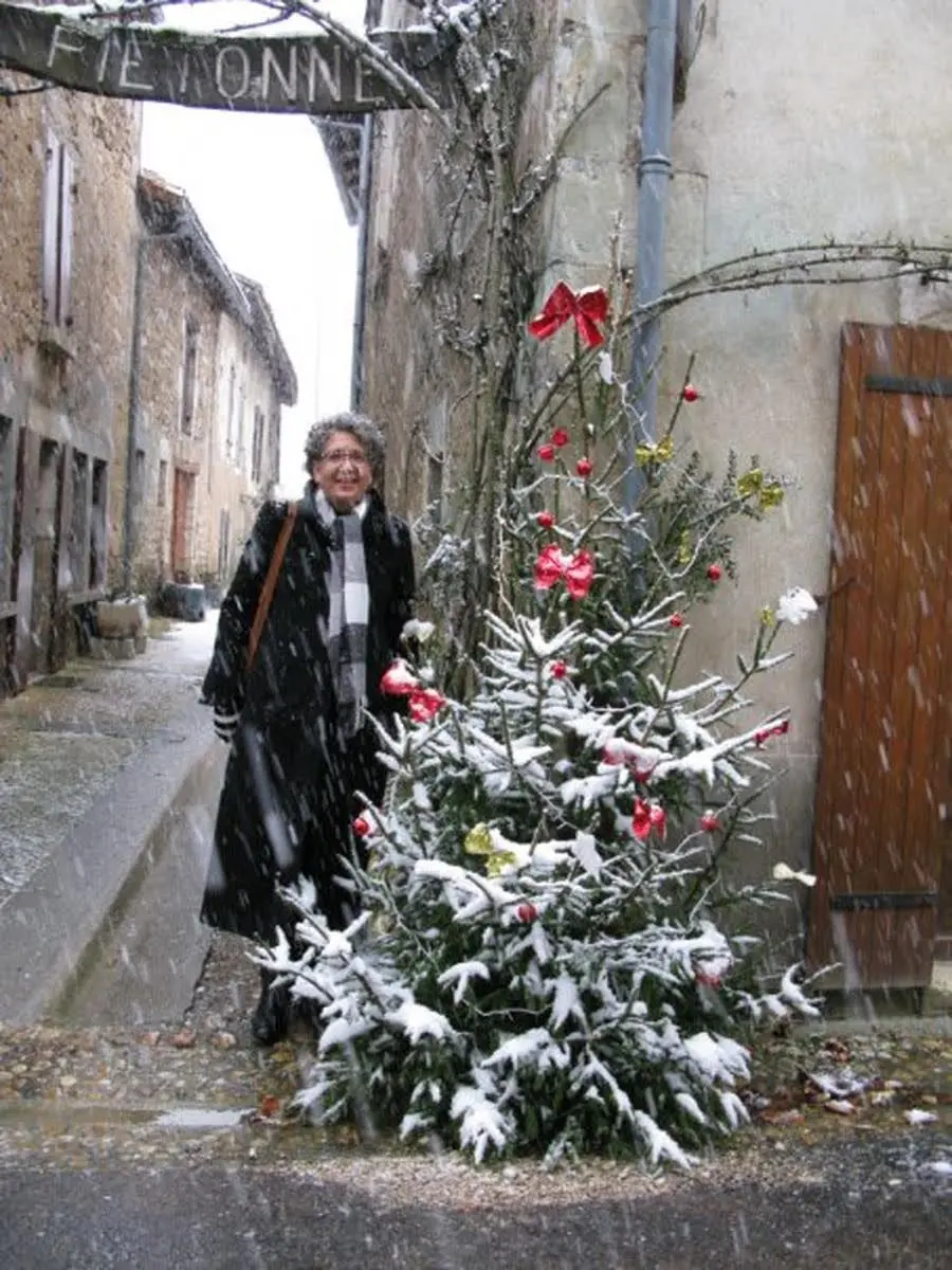 The forecast for that night was for a small flurry of snow, unlikely to settle on the ground. Not quite on the money: we woke up the next day to a gorgeous carpet of snow, several inches thick. The countryside out here is beautiful anyway, but now it is really breath taking – check out the photos. And how glad we are to have gotten the brakes sorted just in time for icy roads! Eager to get out and play, we jumped in the car and took Mimi to our latest favourite place, St Jean de Côle. We had a fantastic and leisurely lunch at the only restaurant in town, during which time, the snow started up again. We then strolled through the town for as long as we could stomach the cold before making our way homewards.