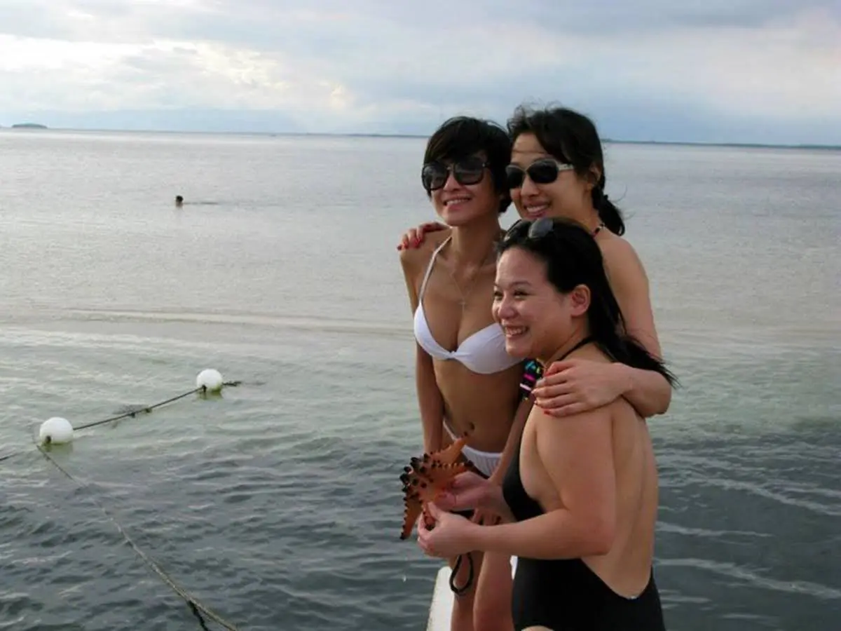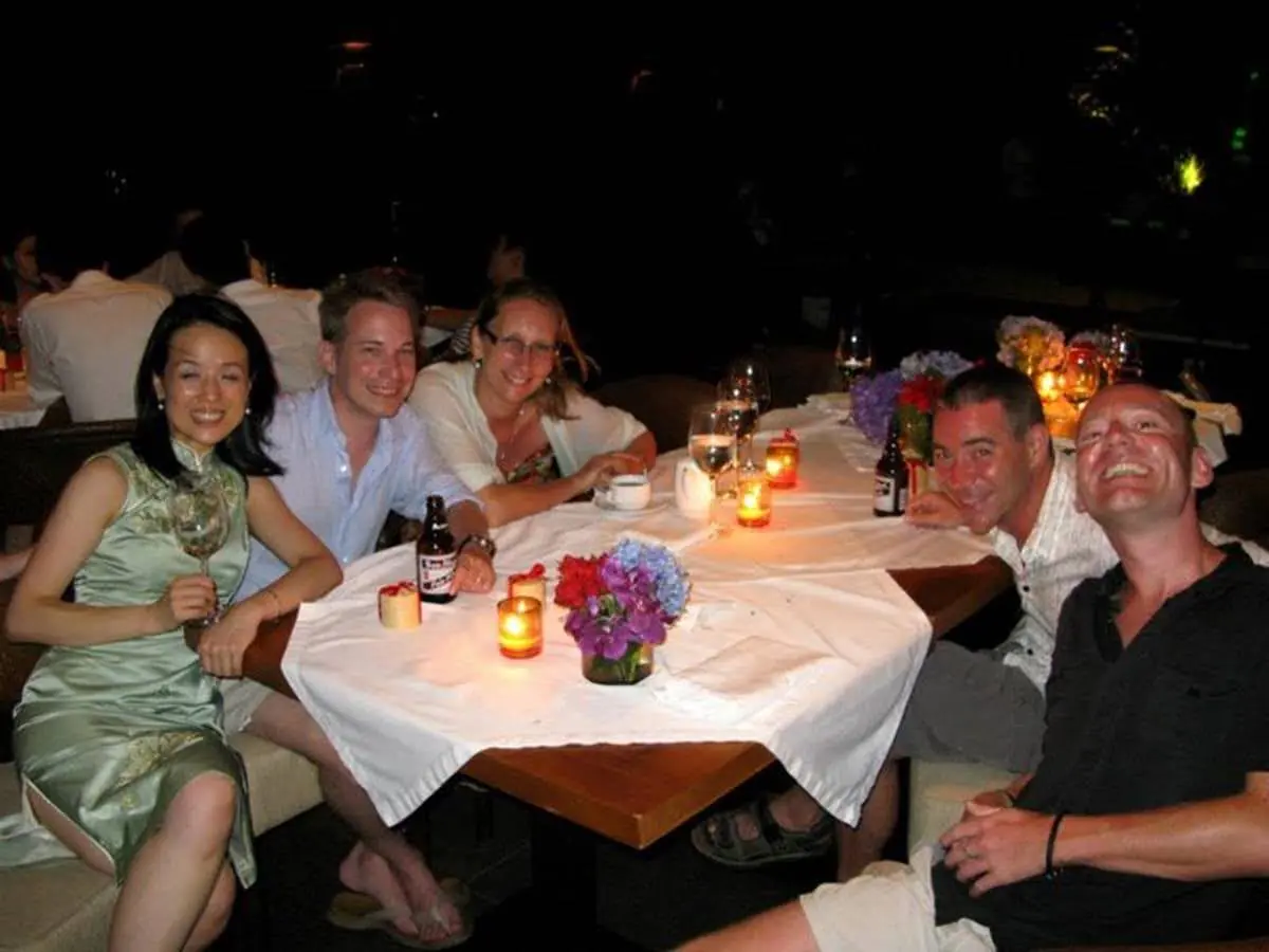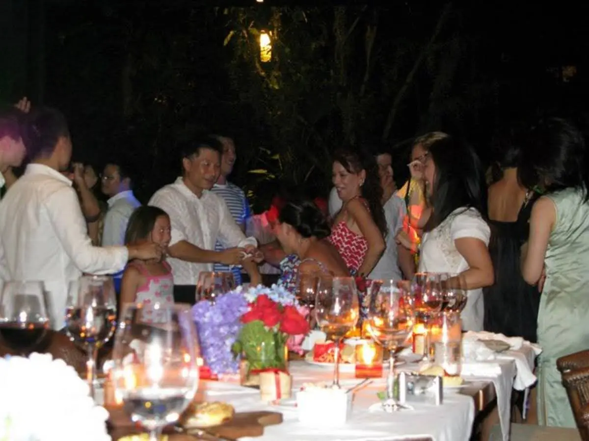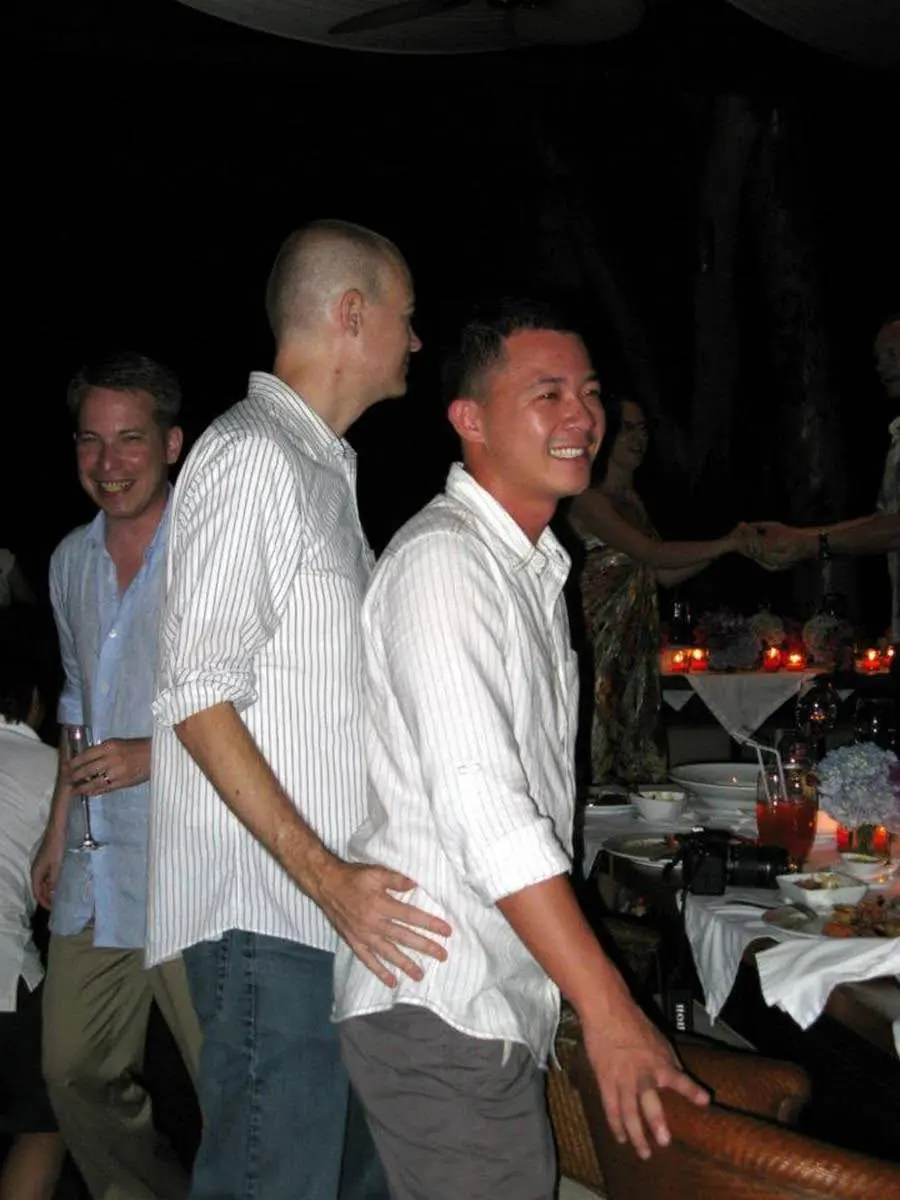 Friday morning involved lounging around the pool for a bit and then a big group of us spent the afternoon on the boat. By this time, more guests had arrived including another gay couple, Jacob and Assan from Hong Kong and Thailand respectively. In addition to the wedding party and family, there were a few other friends bringing the total to 17 people plus four crew. The boat itself was long and narrow with bamboo outriggings for support and powered by an outboard motor. We left port and headed out to a reef where most of us went snorkeling. This was followed by sandwiches and beer while we went to our next destination, a small island with a sandbar good for collecting shells. On the way back, we had champagne and all was going really well until we got caught in a tropical storm about 30 minutes before arriving back. The boat is covered but otherwise open on the sides so very little protection from the wind and rain so we were all wrapped up in towels and shivering as we watched the lightening hit the shore only a mile or two away. We made it back and instead of going out to dinner as planned, had dinner at the resort. The restaurant is open to the public and was fully booked so they weren’t too happy with our idea but they made room for us as well as a number of others who arrived that evening.