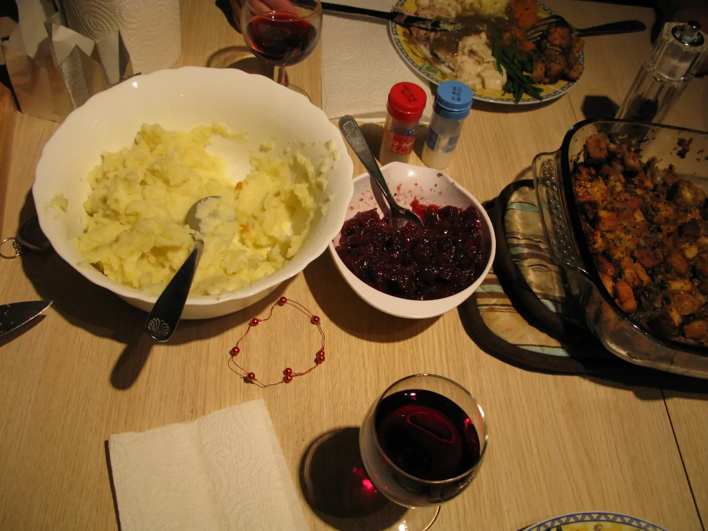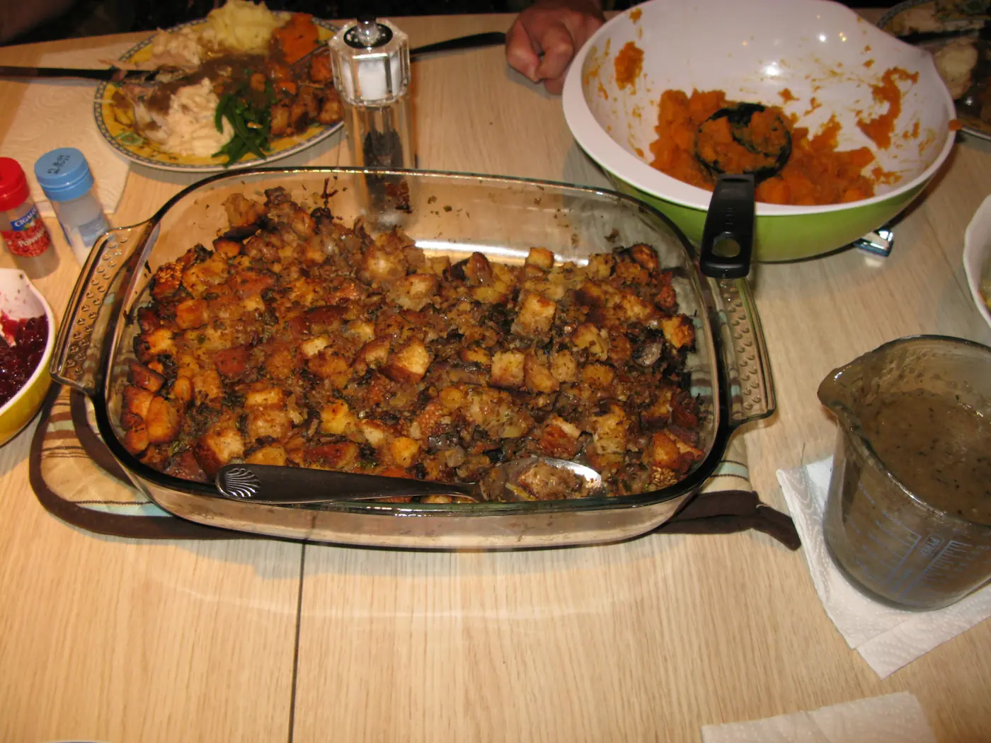 I’d done a whole roast turkey before but never parts. The legs were cooked in the oven and the breast in a casserole on the hob. Both came out fine, although the breast was a bit on the dry side. For the past few Thanksgivings in London, we’ve been privileged to have David White’s cornbread stuffing, which is extra specially tasty. So this was my first attempt at making stuffing and I have to say, it came out really nicely (thanks for the tips, Mom). The others were from recipes found on epicurious.com. Despite having to use dried cranberries, they too turned out rather nicely.